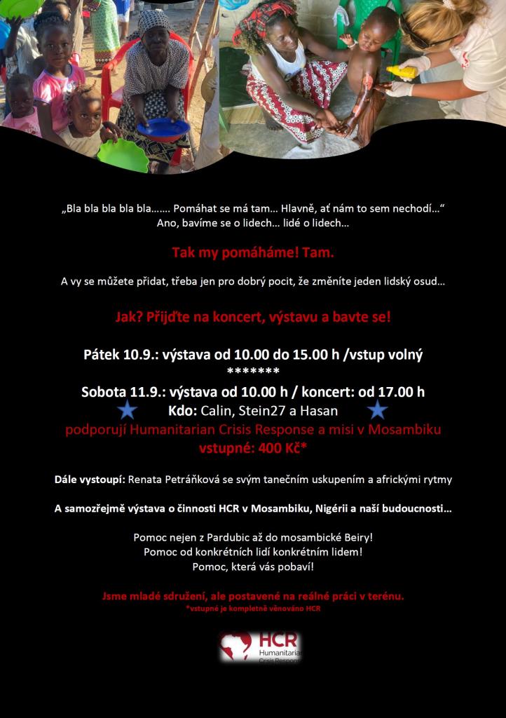 Zveme vás tento pátek 10. a sobotu 11. září na zámecké nádvoří kde se uskuteční zajímavá výstava presentující práci humanitární organizace HCR - Humanitarian Crisis Response, která pomáhá zejména v africkém Mosabiku a Nigérii.