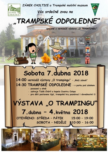 Trampské odpoledne a vernisáž výstavy "O trampingu" Tuto sobotu zahájíme "Trampské odpoledne" ve 14 hodin vernisáží výstavy na "Malém zámku" věnované právě trampingu. Od 14:30 pokračujeme pod zámkem v parku posezením u ohně, opékáním špekáčků, zazpívá Tulák Chárlí a kapela Country Colaps, pro děti jsou připraveny různé soutěže, postaveno týpí... Pěkné počasí objednáno!?